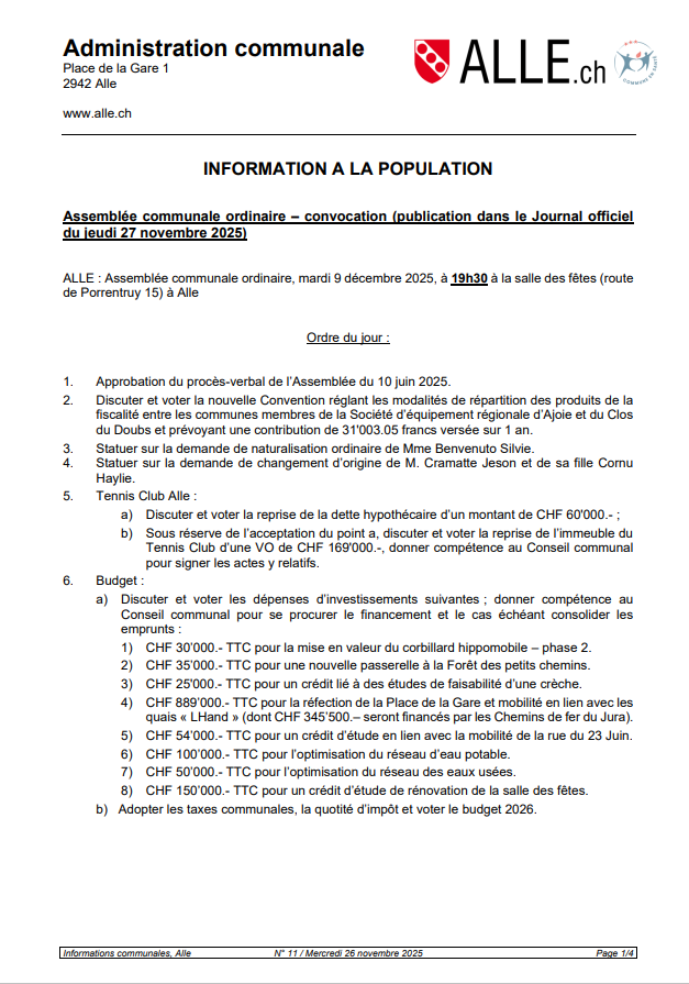Assemblée communale ordinaire – convocation (publication dans le Journal officieldu jeudi 27 novembre 2025)Actualité / 4 décembre 2025 4 décembre 2025